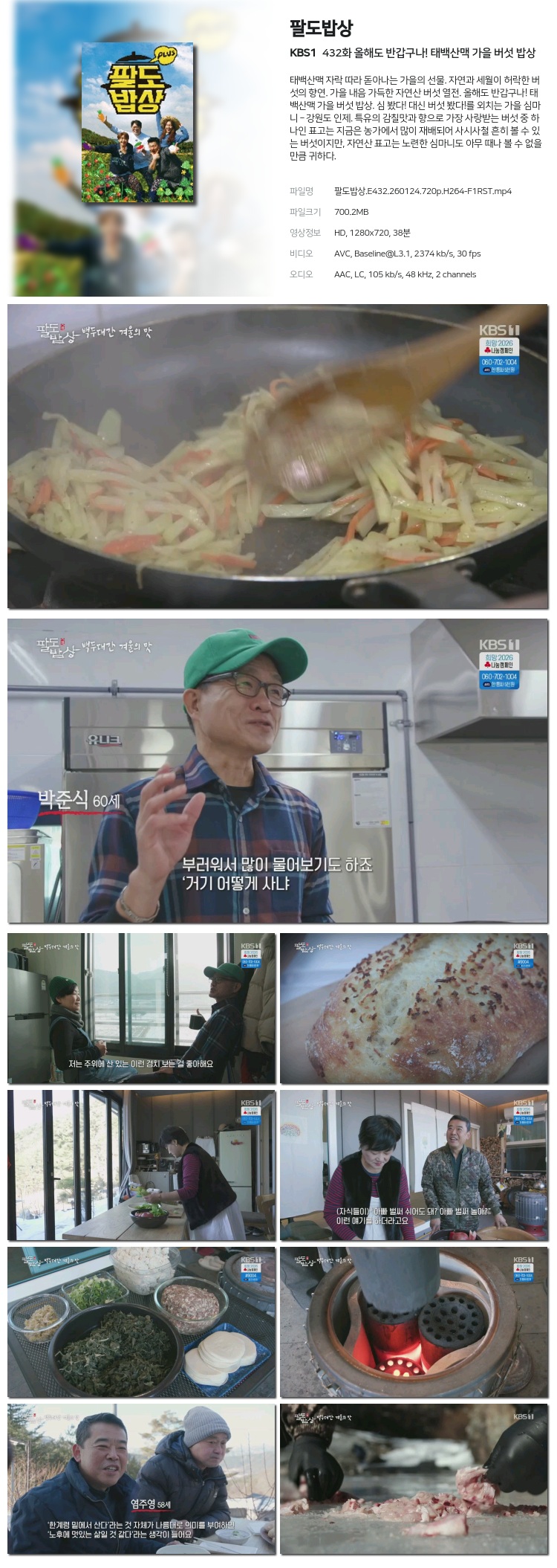 [KBS1] ÆÈµµ¹ä»ó ¿ÃÇØµµ ¹Ý°©±¸³ª! Źé»ê¸Æ °¡À» ¹ö¼¸ ¹ä»ó.E432.260124.720p.H264-F1RS... 700.2M µ¿¿µ»ó