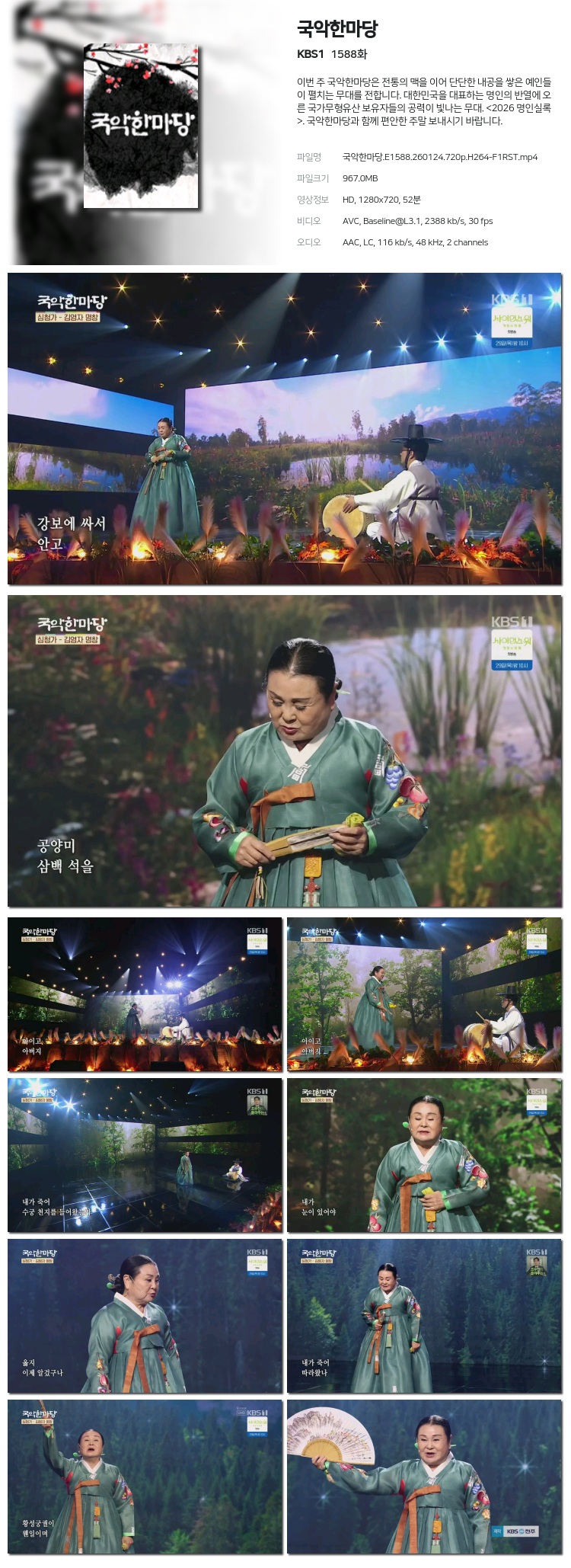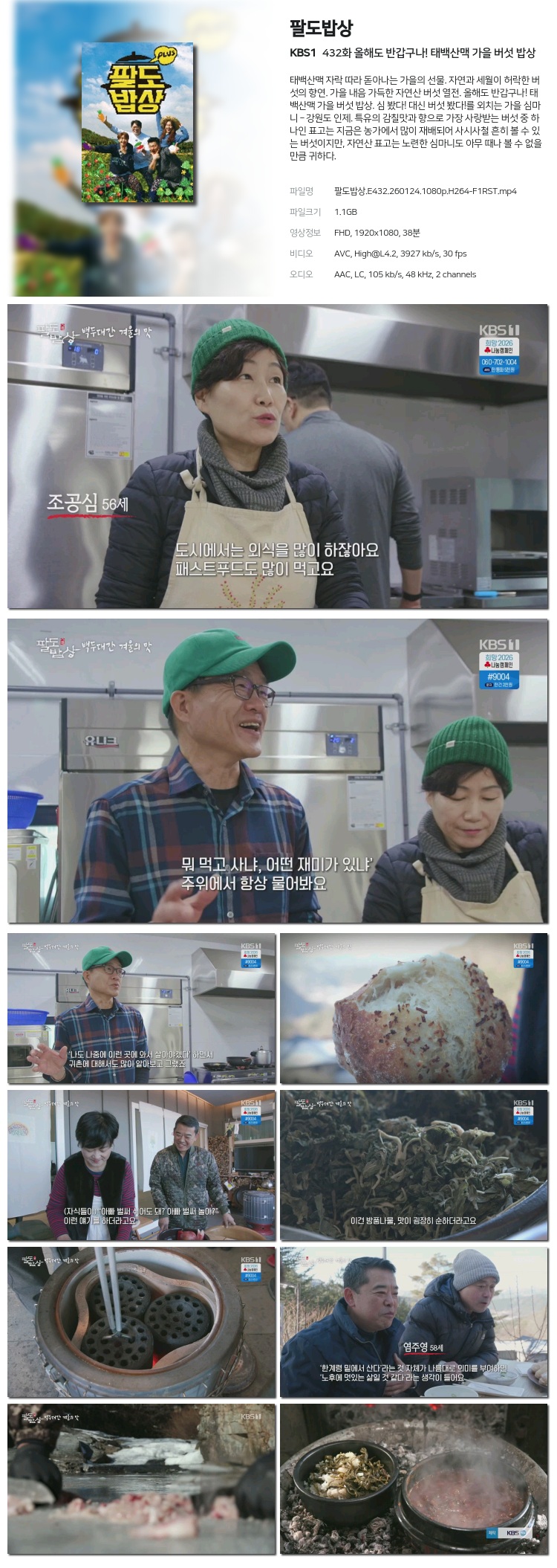 [KBS1] ÆÈµµ¹ä»ó ¿ÃÇØµµ ¹Ý°©±¸³ª! Źé»ê¸Æ °¡À» ¹ö¼¸ ¹ä»ó.E432.260124.480p.H264-F1RS... 296.7M µ¿¿µ»ó