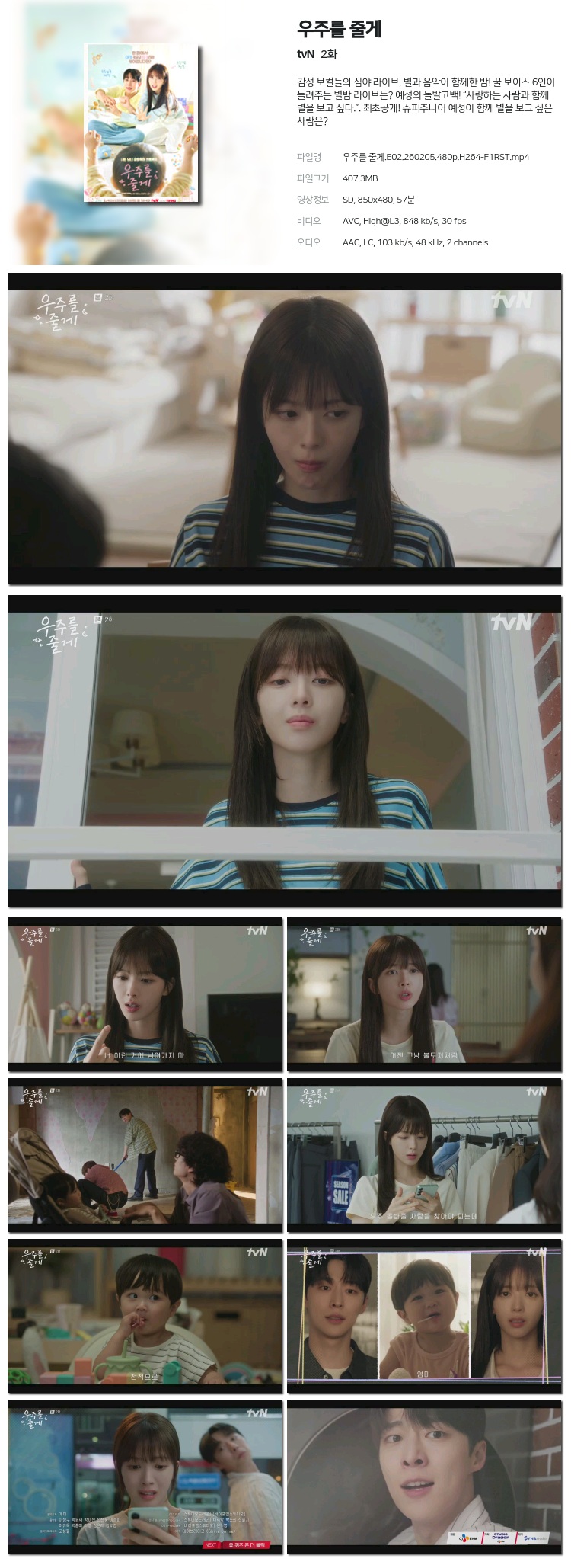 [tvN] ¿ìÁÖ¸¦ ÁÙ°Ô.E02.260205.480p.H264-F1RST... 407.3M Ãֽŵå¶ó¸¶