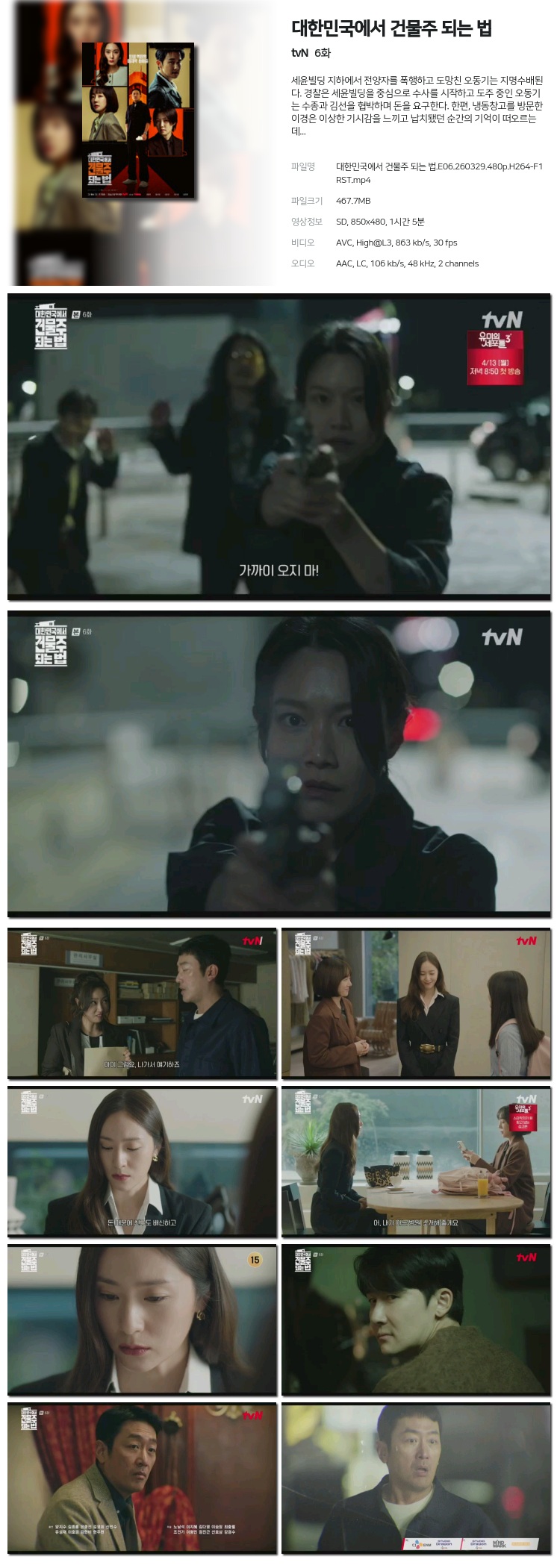 [tvN] ´ëÇѹα¹¿¡¼­ °Ç¹°ÁÖ µÇ´Â ¹ý.E06.260329.480p.H264-F1RST... 467.7M Ãֽŵå¶ó¸¶