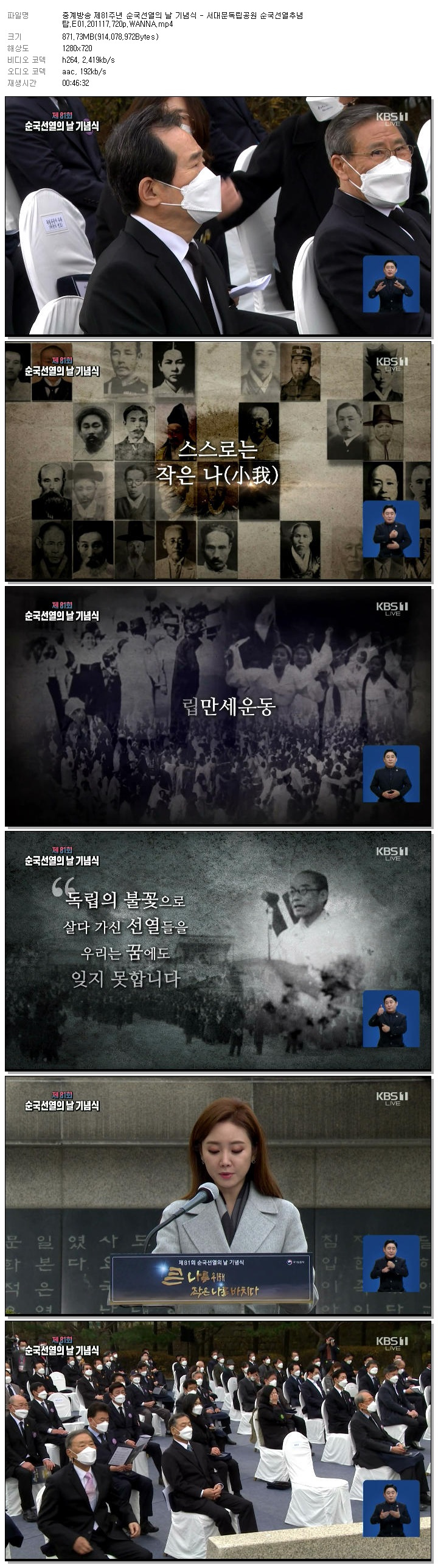 Áß°è¹æ¼Û Á¦81Áֳ⠼ø±¹¼±¿­ÀÇ ³¯ ±â³ä½Ä - ¼­´ë¹®µ¶¸³°ø¿ø ¼ø±¹¼±¿­Ãß³äž.E01.201117.720p.WANNA... 871.7M µ¿¿µ»ó